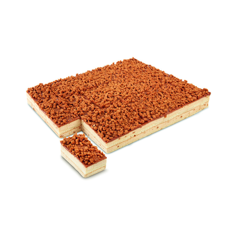 Precut cake layered with Lotus Biscoff spread — caramelized flavor and smooth creamy texture. كعكة مقطعة مسبقًا بطبقات من كريمة لوتس بيسكوف بنكهة كراميل لذيذة وقوام كريمي ناعم.