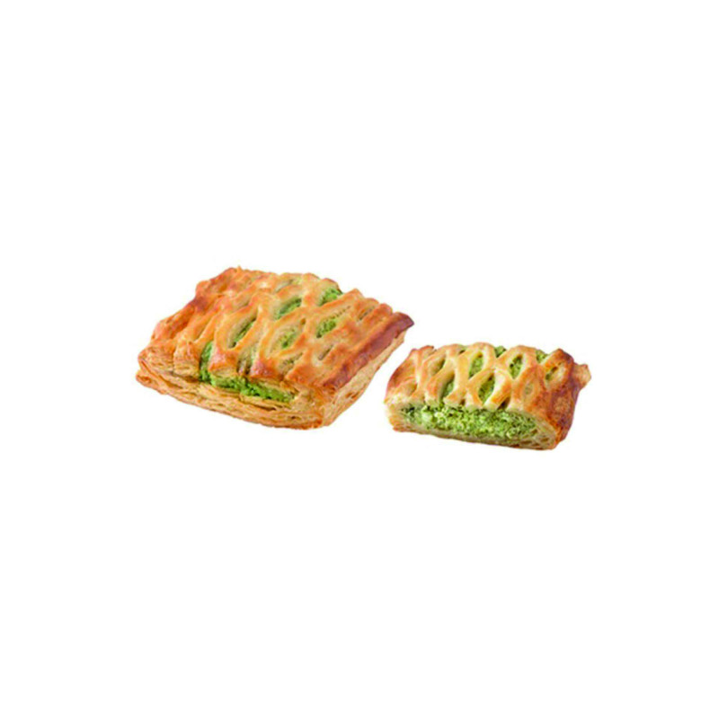 Savory pastry filled with vegetables like spinach or peppers, covered with a lattice crust. Crisp exterior, soft filling. معجنات مالحة محشوة بالخضار مثل السبانخ أو الفلفل، مغطاة بعجينة مشبّكة؛ قشرة مقرمشة وحشوة طرية.